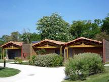 Pavillon 3/4 personnes (32m2) : séjour salon avec 2 canapés lit (90x190), télévision, coin cuisine avec kitchenette équipée (plaques chauffantes, réfrigérateur, four micro-ondes, cafetière électrique, vaisselle et ustensiles de cuisine), une chambre indépendante avec 2 lits simples (90x190), salle de bain avec WC.